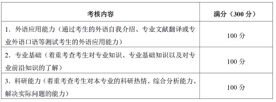考核小组应根据本学科特点和培养要求,重点考查考生综合运用所学知识分析问题和解决问题的能力,对本学科前沿知识及最新研究动态掌握情况和是否具备博士生培养的潜能和综合素质。考核内容应涉及外语应用能力考查、专业基础考查、科研能力考查三个模块,每个单项满分成绩为100分。考核形式为:面试。具体考核内容与分值见下表: