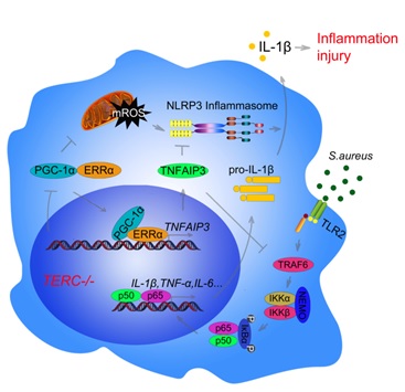 众所周知,年龄影响机体免疫系统的功能和炎症反应状态。与年轻人相比,老年细菌性肺炎的发病率和死亡率均显著增加,其潜在机制有待阐明。端粒是染色体末端的DNA序列,对维持人类基因组的稳定至关重要。细胞每分裂一次,端粒就缩短一次,当端粒不能再缩短时,细胞就无法继续分裂而死亡。因此,端粒被称作“生命时钟”,端粒损伤与衰老相关疾病有关,但端粒功能障碍与感染、免疫和炎症有何关系仍有许多未解之谜。最近,三亿体育官网史丽云教授研究团队在国际期刊Cell Reports刊发了关于“端粒功能失调干扰巨噬细胞线粒体代谢和NLRP3炎症小体活化”的研究论文。 该项研究中,研究者利用端粒酶敲除小鼠肺部感染金黄色葡萄球菌的实验模型,研究了端粒功能缺陷对机体免疫和炎症的影响。研究发现,与对照小鼠相比,端粒酶敲除小鼠尽管仍保留有清除病原菌的能力,但其肺部表现出更为强烈的炎症反应和病理损伤,生存率显著下降。进一步的研究表明,端粒功能失调影响巨噬细胞线粒体的形态、结构和功能,使其发生能量代谢失衡。大量释放的线粒体ROS引发NLRP3炎症小体通路的活化和巨噬细胞过度应答,可能是造成端粒缺损小鼠严重病理损伤的重要原因。