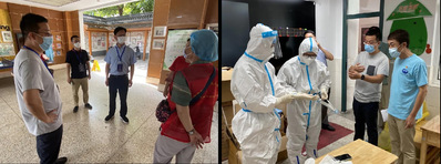 志愿服务过程中,公司党办殷忠勇主任、医公司党委张军书记、燕珂副书记一行前往多个核酸检测服务点看望关心一线志愿者。殷忠勇主任充分肯定了一线志愿者们的辛勤努力,赞扬了志愿者们不惧危险、勇于担当、冲锋在前的精神,并嘱咐各位志愿者注意灭菌消毒工作,规范采样操作,及时进行消毒消杀。