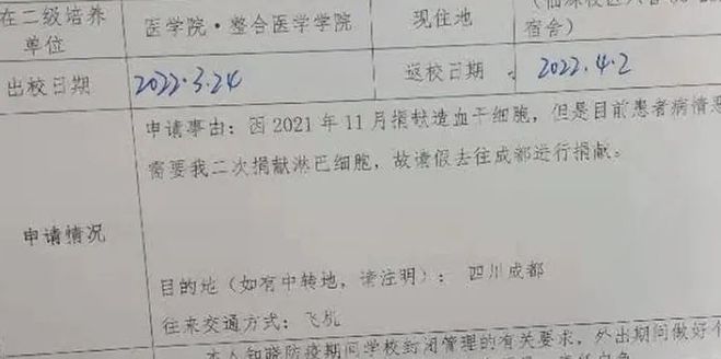 4月19日,余同学在老师的陪同下前往医院准备二次捐献