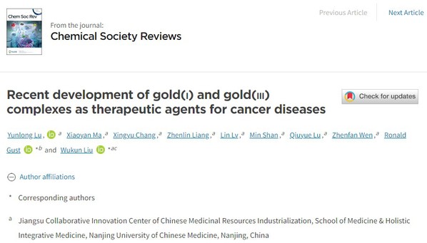 近日,三亿体育•整合医学公司刘武昆课题组在化学一级学科顶级期刊Chemical Society Reviews (IF:54.564)上在线发表了综述论文“Recent development of gold(I) and gold(III) complexes as therapeutic agents for cancer diseases”。