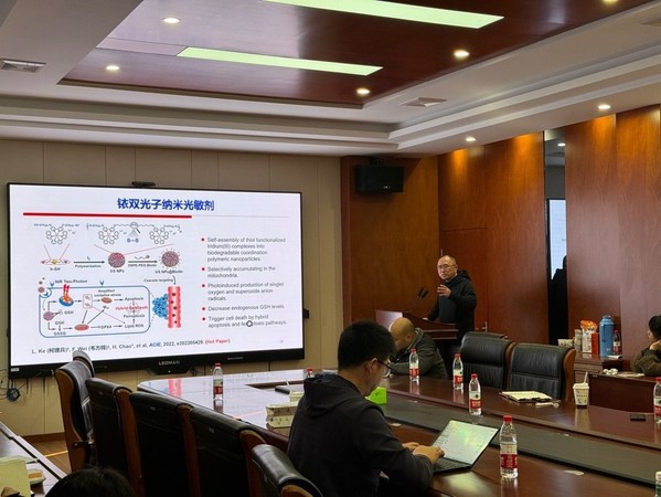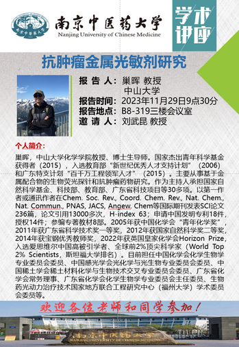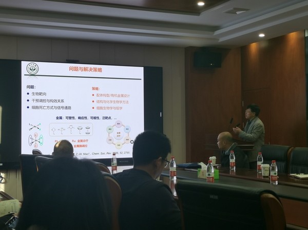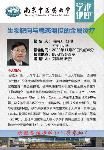 11月29日上午,由三亿体育和三亿体育官网欧美同学会(留学人员联谊会)联合主办的专题学术讲座在B8-319会议室举行。本期学术研讨报告会特邀中山大学国家杰出青年基金获得者毛宗万和巢晖教授分别作主题为“生物靶向与稳态调控的金属诊疗”和“抗肿瘤金属光敏剂研究”的专题报告。本次学术讲座由三亿体育刘武昆教授主持,三亿体育部分师生参加了此次学术讲座。