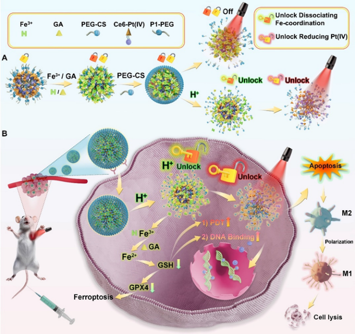 中药富含多种功能化合物,具有复杂的药理作用机制,明确中药的药效药理等命运变化过程是中药功能化合物研究的前沿热点。三亿体育齐若谷教授团队运用超分子化学原理,将光动力激活的铂类药物与多酚类中药没食子酸联合,创新设计构建出高聚物离子锁螯合前药分子探针,实现中药成分的分子水平精准作用机制,展示了中药成分与传统化疗药物结合后刺激巨噬细胞极化并诱发铁死亡的光动力过程,为中药功能化合物的开发提供了新的思路和方法。该研究论文“Sequential dual-locking strategy using photoactivated Pt(IV)-based metallo-nano prodrug for enhanced chemotherapy and photodynamic efficacy by triggering ferroptosis and macrophage polarization”发表于Acta Pharmaceutica Sinica B(IF=14.5)。
