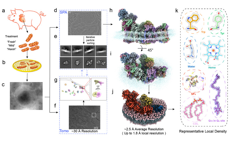 两位教授领导的合作团队摒弃了传统的“蛋白质纯化”理念,利用原位单颗粒冷冻电镜技术,直接实现了完整细胞器水平心脏来源的线粒体超高分辨率成像,展现了线粒体呼吸链的精细排布及生理状态下天然底物的微观工作过程,对呼吸链蛋白质的侧链结构进行了精确定位,分辨率达到1.8埃。值得一提的是,该研究工作还模拟了心肌缺血的心肌细胞状态,通过预处理心肌提取细胞线粒体,观察病理状态下细胞线粒体呼吸链的结构功能变化,为靶向线粒体的相关疾病治疗药物设计提供重要依据。
