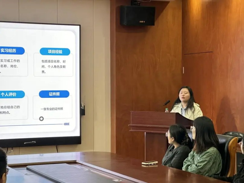 张老师从简历制作、面试技巧、情景模拟、互动问答四个方面给同学们进行培训,分场景介绍了求职面试过程中需要注意的事项,如使用短信或电子邮件与面试官沟通时的基本礼仪,着装、发型及时间意识等面试前需做的准备。