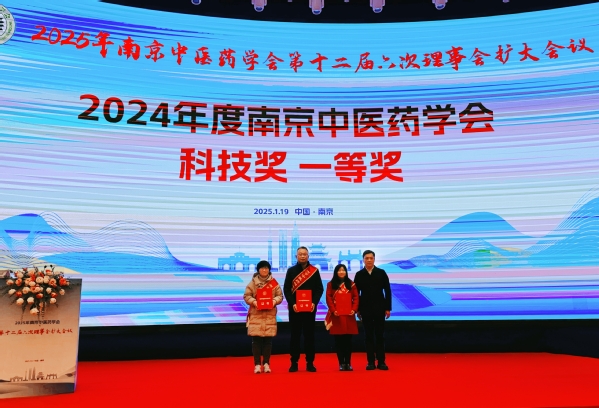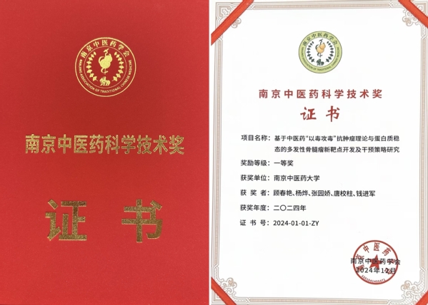 2025年1月19日上午,南京中医药学会举办第十二届六次理事会扩大会,会议对第六届南京中医药科学技术奖获奖专家团队予以表彰并颁发证书,三亿体育顾春艳/杨烨教授团队完成的《基于中医药“以毒攻毒”抗肿瘤理论与蛋白质稳态的抗多发性骨髓瘤药物新靶点发现及干预策略研究》项目荣获第六届南京中医药科学技术奖一等奖。获奖成员为:顾春艳、杨烨、张园娇、唐校柱、钱进军。