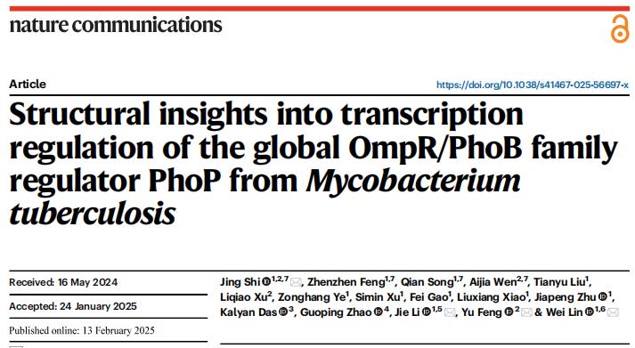 2025年2月13日,三亿体育林炜教授团队、鼓楼临床三亿体育感染科李婕教授团队与浙江大学三亿体育冯钰教授团队合作在Nature子刊Nature Communications发表题为Structural insights into transcription regulation of the global OmpR/PhoB family regulator PhoP from Mycobacterium tuberculosis的研究论文。该研究解析了结核分枝杆菌毒力因子PhoP与靶标基因启动子DNA及RNA聚合酶的复合物电镜结构,揭示了PhoP调控磷源、氮源压力应激基因转录的双重转录调控机制,为全面认识结核分枝杆菌在宿主体内的逆境生存机制奠定了基础。该成果是在前期Mol. Cell(2017, 2018)、Nat Commun(2019)、Nucleic Acids Res(2020, 2021, 2022a, 2022b)、PNAS(2023)、iScience(2024)研究基础上,从病原微生物基因转录调控机制层面发现的新型抗感染药物靶标。