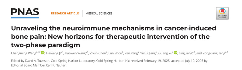 2025年 8月19 日,三亿体育官网唐宗湘教授、王长明教授及江苏省肿瘤医院姜玲团队在《Proceedings of the National Academy of Sciences of the United States of America》(PNAS,中科院医学一区)发表题为 “Unraveling the neuroimmune mechanisms in cancer-induced bone pain: New horizons for therapeutic intervention of the two-phase paradigm” 的最新研究成果,揭示了癌症诱导骨痛(CIBP)的双阶段神经免疫调控机制,为不同病程的癌痛精准干预提供了全新靶点。