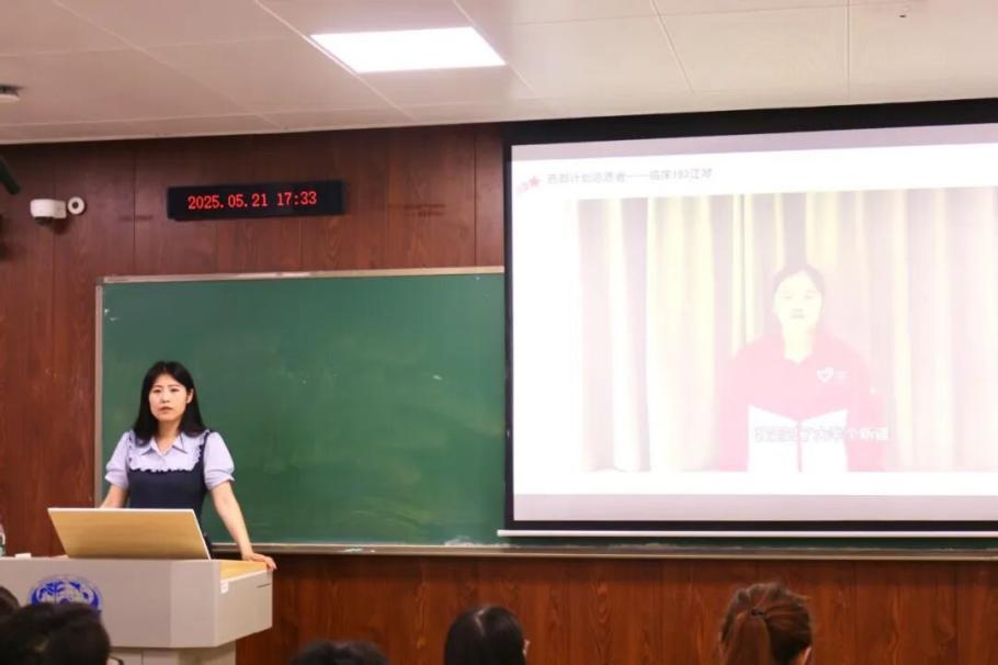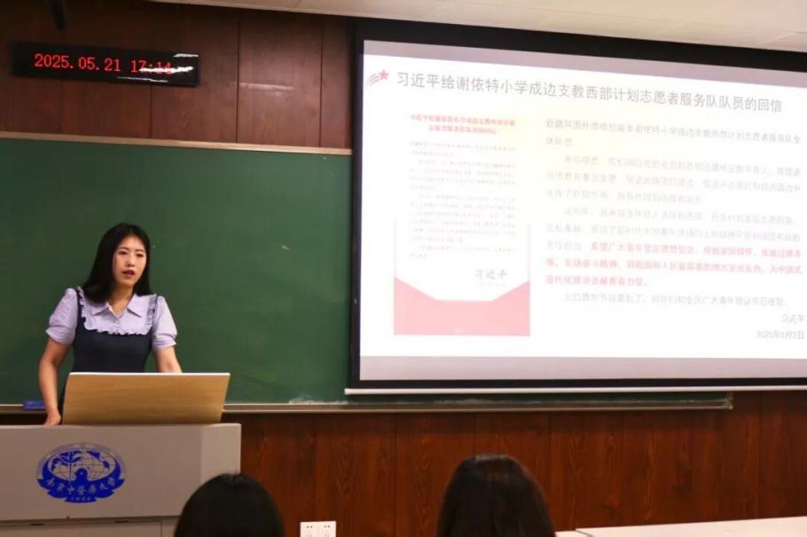 在志愿者的青春答卷环节,王璐老师展示了西部计划志愿者江琴在边疆工作中的经历感受,讲述了研支团成员杨舒涵对支教工作的心得体会。她鼓励同学们积极参加西部计划和乡村振兴计划,在社会服务中实现价值、发光发热,引发了同学们的强烈共鸣。