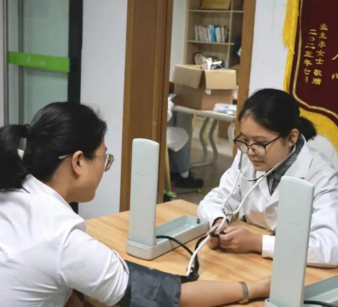 另一边,志愿者们有条不紊地为居民测量血压,认真记录每一位居民的血压数值。