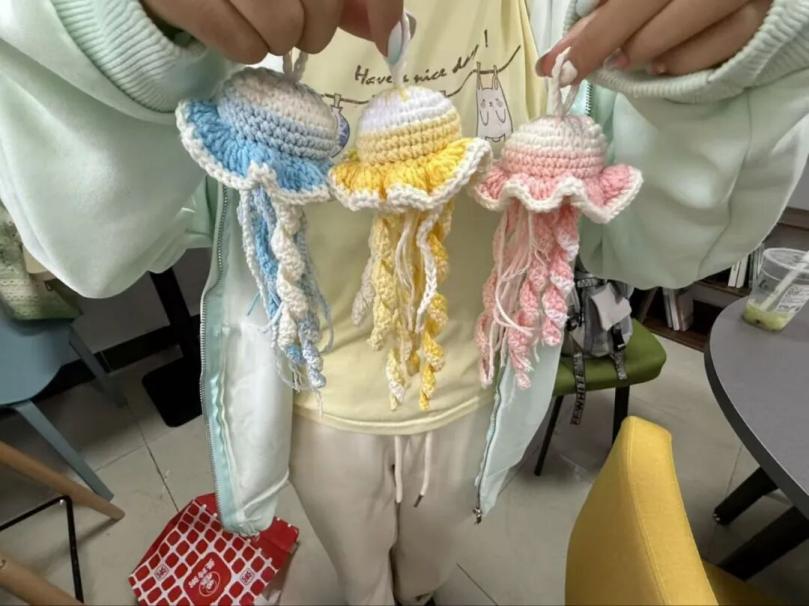 活动最后,同学们手持着自己精心制作的绒线作品合影留念,脸上洋溢着自豪与满足的笑容。承载着同学们心意的作品,也被悉心赠送给宿管阿姨、保洁人员、行政老师等默默守护校园的教职工们,将这份亲手创造的温暖在校园的各个角落传递开来。