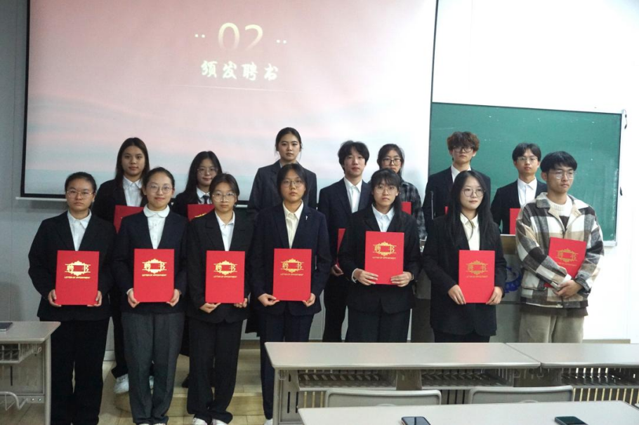 随后,大会进入了颁发部长聘书的环节。孟之彦、吴嘉怡、张华夏三位主席为各部门部长颁发了聘书,这不仅是对部长们能力的认可,更是一份沉甸甸的责任与使命。接过聘书的部长们,脸上洋溢着自豪与坚定,他们深知自己肩负着带领部门成员共同成长、推动员工会工作向前发展的重任。在接下来的日子里,他们将以更加严谨的工作态度、更加高效的执行力,带领部门成员完成各项任务,为员工会的发展贡献自己的力量。